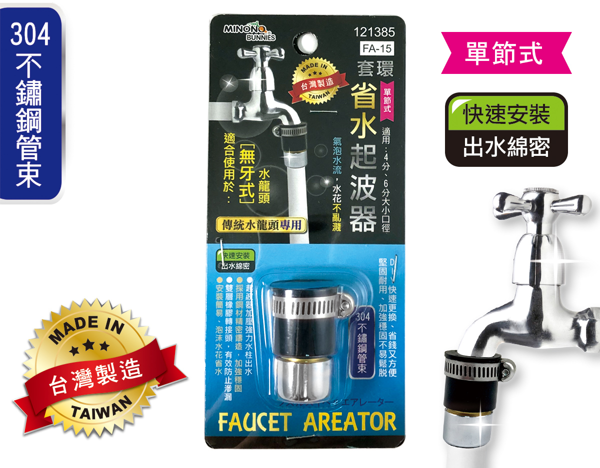 品名: 米諾諾FA-15套環省水起波器 尺寸: 約直徑2x長4cm(±5%) 包裝: 18x8.3x2.3cm 箱入數: 60個/箱 條碼: 4714118121385