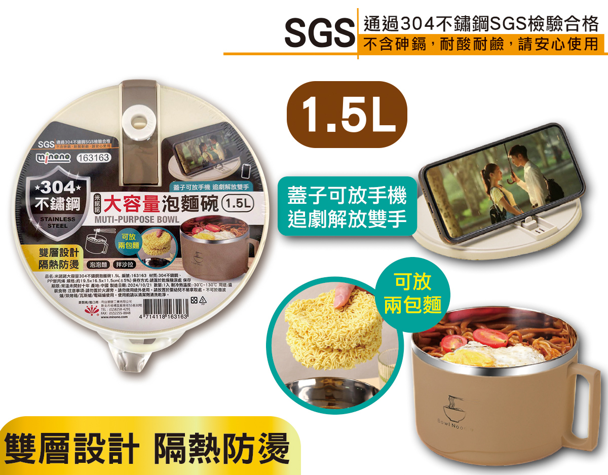 品名: 米諾諾大容量304不鏽鋼泡麵碗1.5L
