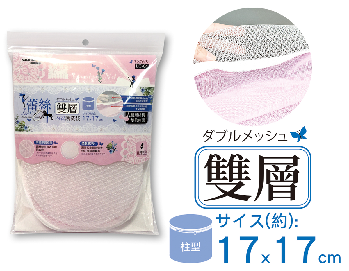 品名: 米諾諾LC-04蕾絲雙層內衣護洗袋17x17cm 尺寸: 約直徑17x高17cm(±5%) 包裝: 25.5x19.5x3.2cm 箱入數: 144個/箱 條碼: 4714118152976